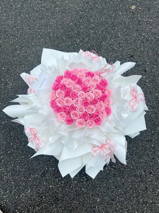 52 Stalks Pink Preserved Roses with Baby breath in Dreamy White