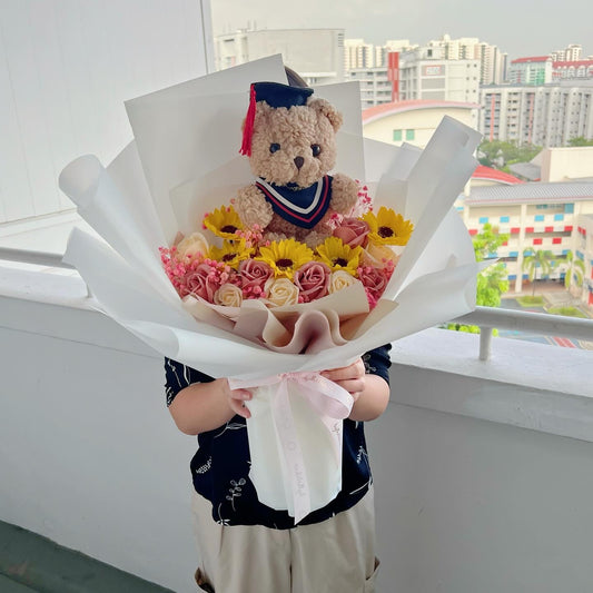 Graduation Bear with Soap Sunflower and Roses Bouquet - White Pink