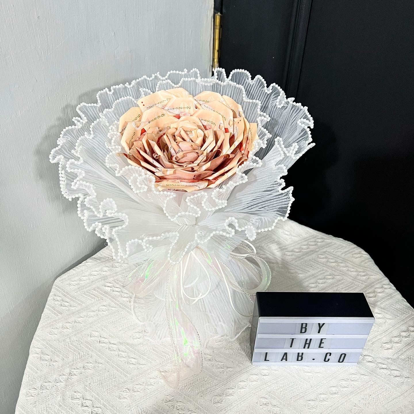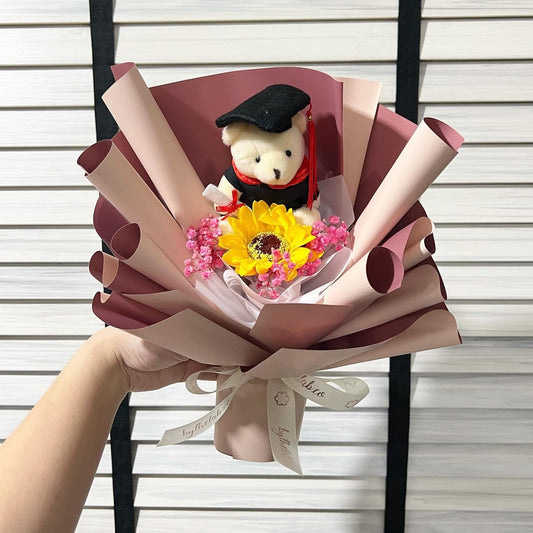 Graduation Character with Soap Sunflower and Roses Bouquet - Kraft Peach Pink