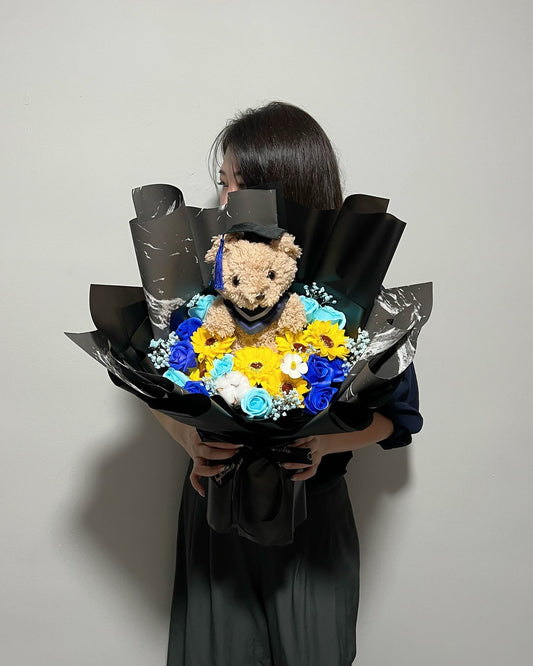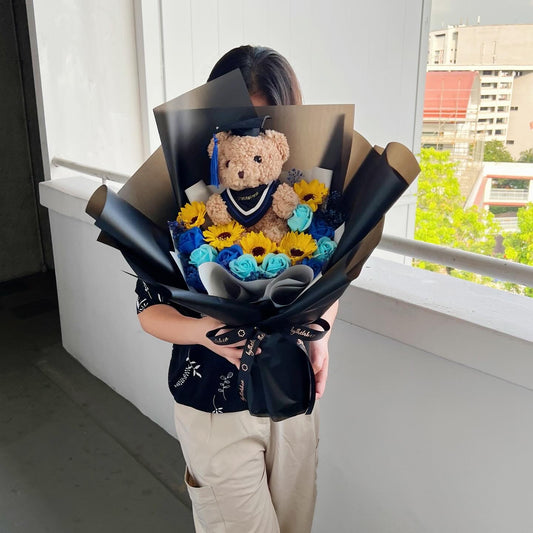 Graduation Character with Soap Sunflower and Roses Bouquet - Kraft Blue