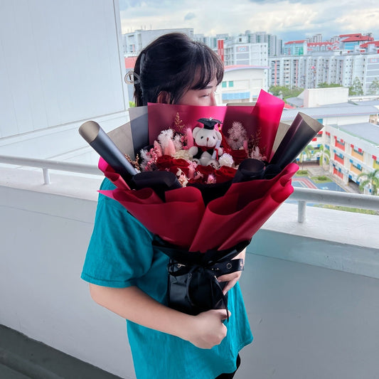 Graduation Bear with Soap Roses Bouquet in White Wrapper - Aurora Grey Roses
