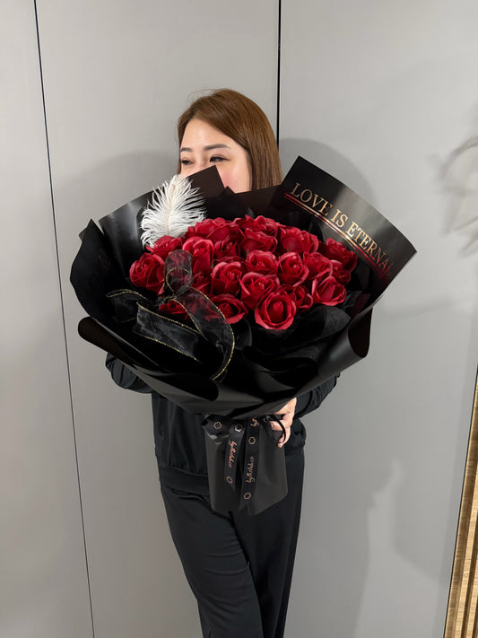 Feathery Love is Eternal 33 Stalks Red Soap Roses Bouquet in Black