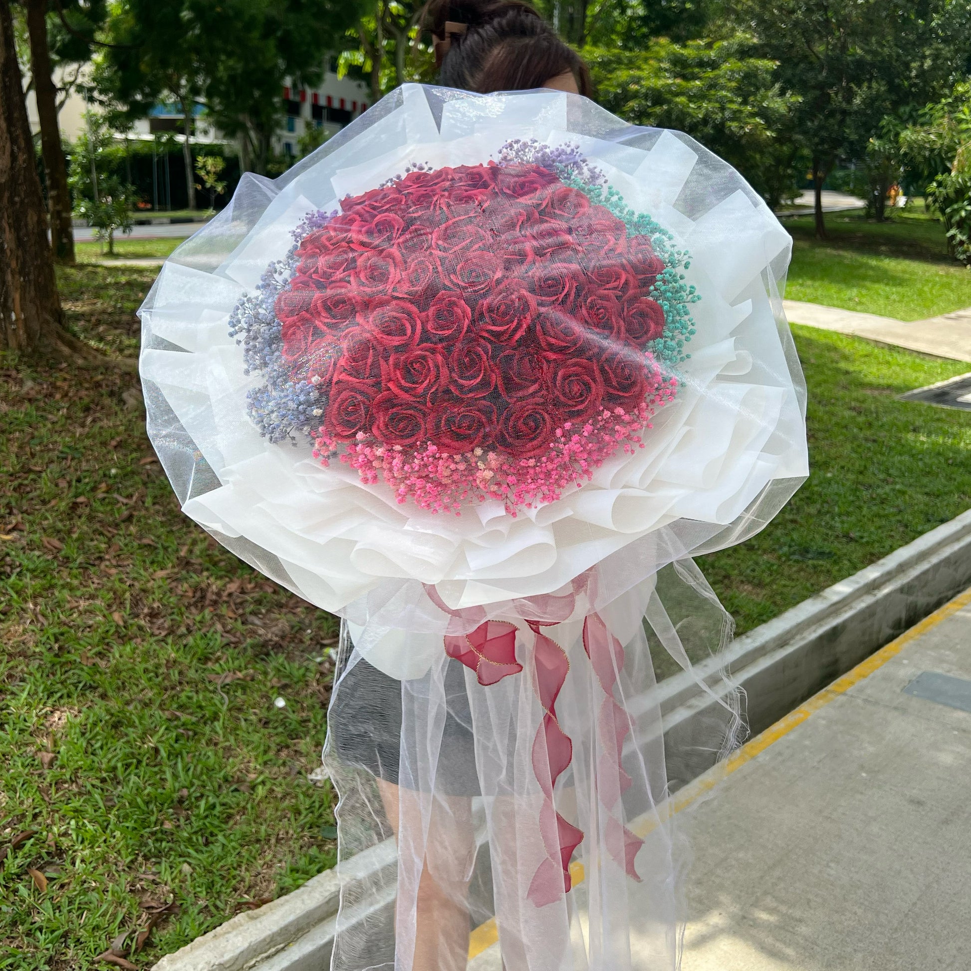 Comes in 52 Stalks Red Soap Roses Bouquet with Multicolor Preserved Baby breath at the side to compliment the look.