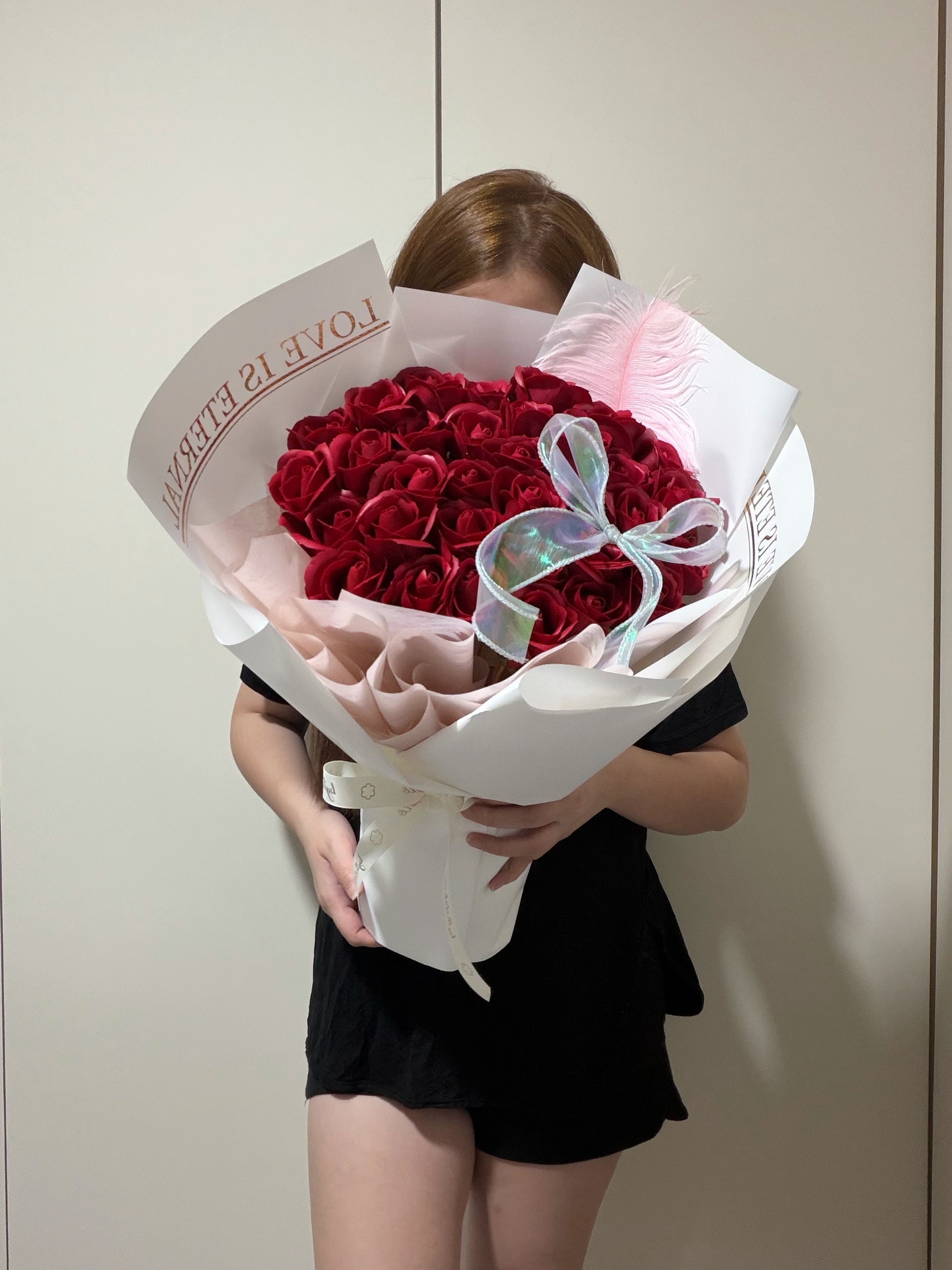 Feathery Love is Eternal 33 Stalks Red Soap Roses Bouquet in White